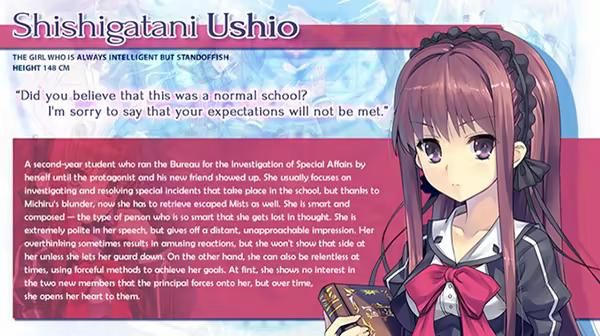 这个女孩向困惑的两人说明了情况:这所学院存在着魔法。当钟楼的钟声响起时,”夜之领域”就会出现,并与校舍融合。调查局的工作就是处理由此产生的超自然问题。就这样,古河开始努力保护学校免受被称为”雾”的麻烦魔法物品的侵害……